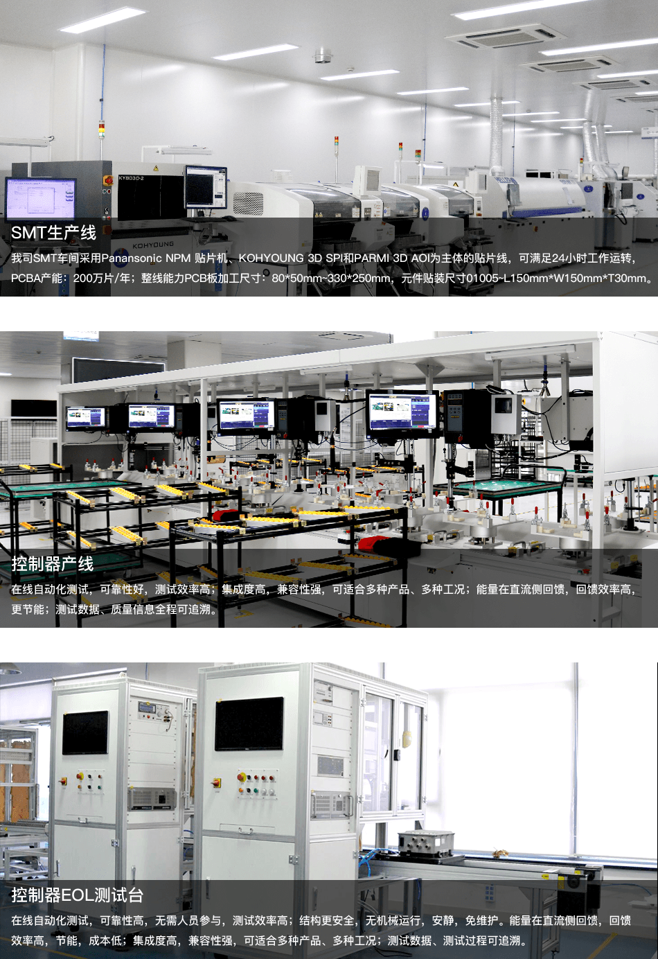 公司主要生产制造自主研发的SMT贴片和电机控制器,以自动化生产装备和先进的制作工艺以及智能化管理系统为基础,在一批具有高精尖人才团队的努力下,为各大整车厂提供高性能,高稳定性,高集成度的优质新能源动力系统产品。